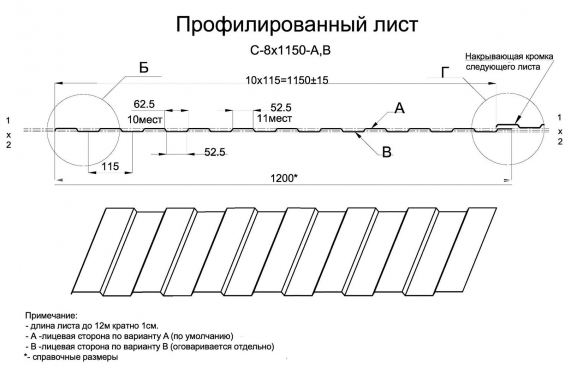 Описание Окрашенный профнастил C-8х1150 — один из классических видов стенового материала. Имеет достаточно широкую сферу применения и используется для облицовки фасадов промышленных и жилых зданий, возведения стен и перегородок. Профнастил C-8х1150 имеет трапецевидную форму профиля небольшой высоты (8 мм) и шагом средней длины (52,5 мм) и прекрасно дополнит архитектурные решения в любом современном стиле. Полимерное покрытие обладает насыщенным цветом, стойкостью к механическим повреждениям и атмосферным явлениям, ультрафиолетовым лучам, благодаря чему профнастил долгое время сохраняет свой насыщенный цвет и эксплуатационные качества. Полимерное покрытие наносится на сторону А по умолчанию, на сторону В — по заказу клиента. Со склада можно приобрести листы профнастила C-8х1150 стандартных размеров (длиной 2, 3 или 6 м) или же сделать индивидуальный заказ: минимальная длина составляет 0,5 м, максимальная — 12 м. Также по желанию заказчика возможно нанесение антиконденсатного покрытия, если профилированный лист C-8х1150 используется в качестве кровельного материала.